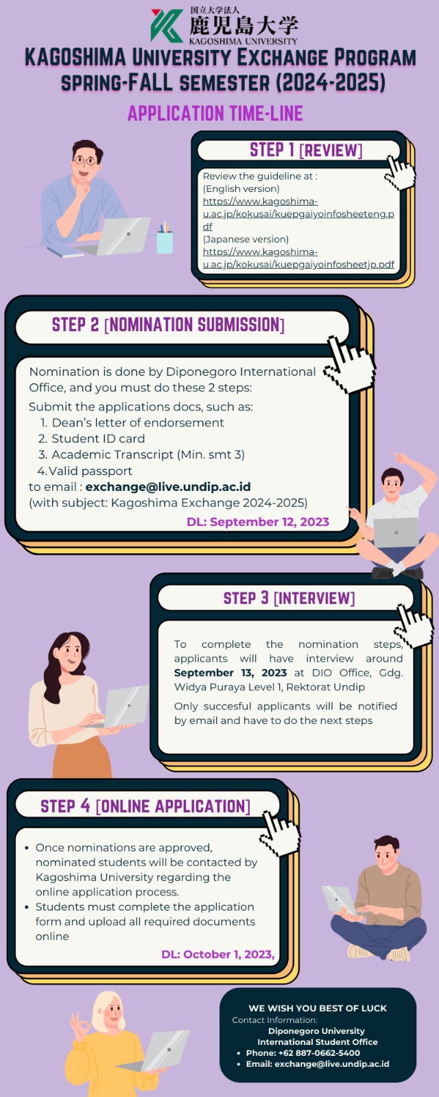 The 2024 Kagoshima University Student Exchange Program is a life-changing opportunity that combines academic excellence with cultural immersion. By participating in this program, you will gain valuable skills, forge international friendships, and broaden your horizons in ways you never imagined. Don’t miss this chance to embark on a global adventure that will shape your future in profound ways. Visit the Diponegoro International Office website today to start your journey toward the 2024 Kagoshima University Student Exchange Program. Your future self will thank you for it.